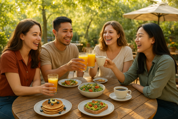 | 프롬프트 | 따뜻한 햇살이 비치는 야외 테라스 카페에서 친구들이 함께 브런치를 즐기고 있는 장면. 나무 테이블 위에는 팬케이크, 아보카도 토스트, 샐러드, 커피, 주스 등이 놓여 있고, 사람들은 웃으며 대화를 나누거나 잔을 부딪치며 즐거운 시간을 보내고 있다. 잔잔한 바람이 불고 주변에는 초록 나무와 화분이 있으며, 밝고 자연스러운 분위기의 고화질 사실적인 사진 스타일. |