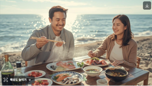 | 프롬프트 | 맑은 하늘 아래, 동해바다를 배경으로 한 남자와 여자가 함께 회를 먹고 있는 장면. 바닷가 근처 야외 테이블 위에는 광어, 연어, 오징어회가 담긴 접시와 소주, 맑은 국이 놓여 있다. 남자는 웃으며 젓가락으로 회를 들고 있고, 여자는 즐겁게 바라보며 잔을 들고 있다. 잔잔한 파도와 푸른 바다, 햇살이 반짝이며 평화롭고 행복한 분위기. 리얼리즘 스타일, 따뜻한 색감, 자연스러운 표정, 고해상도. |