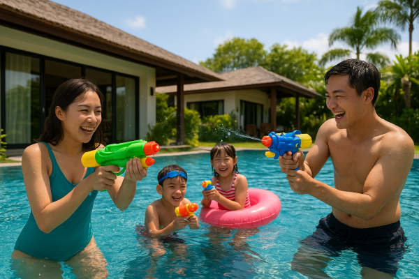 | 프롬프트 | 여름 햇살 아래 현대적인 풀빌라 수영장에서 가족이 물놀이를 즐기고 있다. 부모님과 두 아이가 웃으며 물총 놀이를 하고, 푸른 수영장 물결이 반짝인다. 배경에는 초록 나무와 고급스러운 빌라 건물이 보인다. 밝고 따뜻한 분위기, 선명한 색감, 자연스러운 표정, 여름의 활기찬 느낌. |