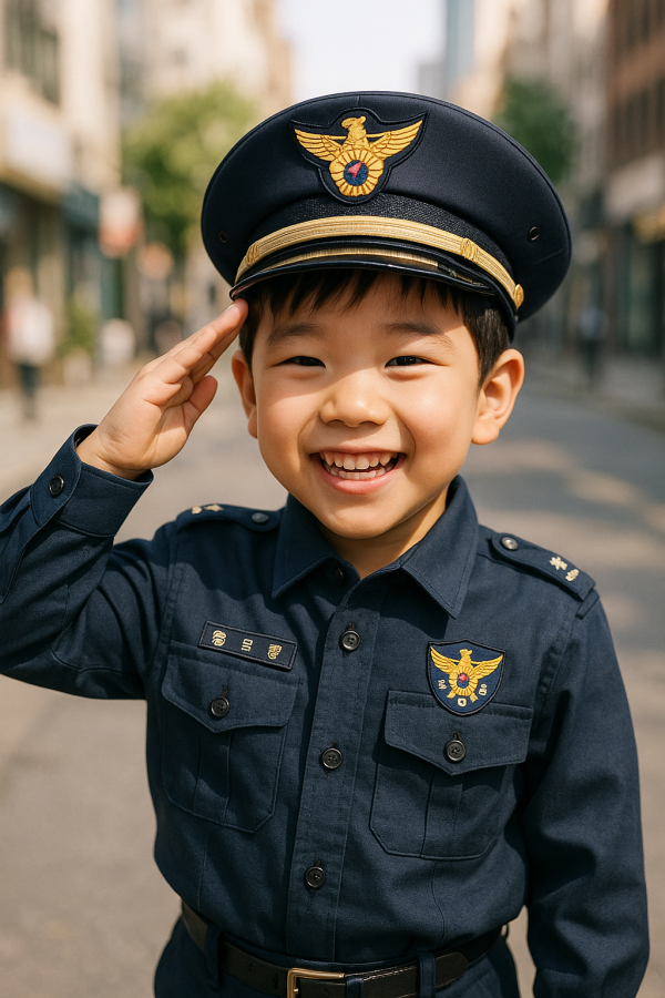 | 프롬프트 | 리얼리즘 스타일의 꼬마 경찰관. 귀여운 한국 어린이가 경찰 제복을 입고 환하게 웃으며 경례하는 모습. 자연광이 비치는 도시 거리 배경, 선명한 얼굴 표정과 사실적인 피부 질감, 깨끗한 제복과 모자 디테일, 따뜻한 색감의 고화질 사진 스타일, 4K, 자연스러운 포즈, 현실적인 카메라 초점. ai 이미지 |