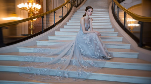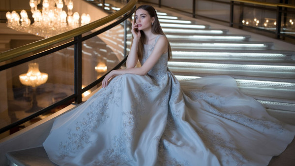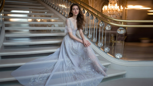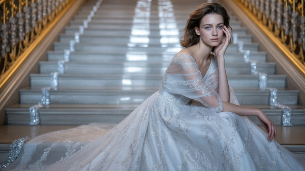 | 프롬프트 | A captivating fashion photograph showcases \\\"Paola Salome\\\" a young and beautiful woman, adorned in a flowing Dior haute couture wedding gown. The gown is a soft blue muy claro hue, exquisitely patterned with flowers and featuring delicate, sheer lace panels that catch the light, as she gracefully sits upon a sweeping staircase. The staircase boasts a gleaming gold handrail and translucent crystal steps, while a blurred, opulent ballroom forms the background, softly lit by diffused ambient light creating a dreamlike atmosphere. This portrait embodies timeless elegance and refined sophistication, capturing a moment of serene beauty. |