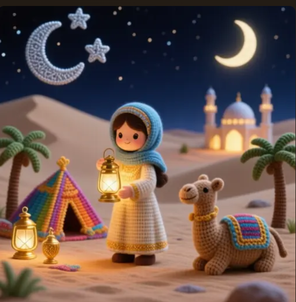라마단 밤의 평화로운 분위기를 따뜻하고 귀엽게 담아냅니다.