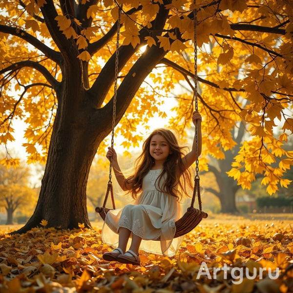 | 프롬프트 | 황금빛 은행나무 아래에서 부드럽게 그네를 타고 있는 긴 머리의 웃고 있는 어린 소녀. 가을바람에 머리카락이 살랑이며 흩날리고, 햇살은 황금빛 나뭇잎 사이로 부드럽게 스며든다. 땅에는 수북이 쌓인 노란 은행잎이 깔려 있고, 따뜻하고 포근한 오후의 분위기. 꿈결 같은 시네마틱한 소프트 조명, 치유되고 평화로운 감성, 따뜻하고 느긋한 분위기. 동화 속 한 장면처럼 섬세하고 아름다운 힐링 일러스트. 고해상도, 부드러운 금빛 톤. |