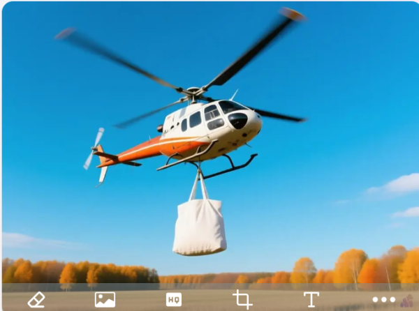 | 프롬프트 | 맑고 푸른 하늘을 배경으로 헬리콥터가 날고 있습니다. 헬리콥터 아래에는 커다란 하얀 가방이 매달려 있고, 아래로는 가을빛으로 물든 들판이 펼쳐져 있습니다. 따뜻한 색감의 들판이 어우러져 전체적으로 가을의 풍요롭고 즐거운 분위기를 자아냅니다. |