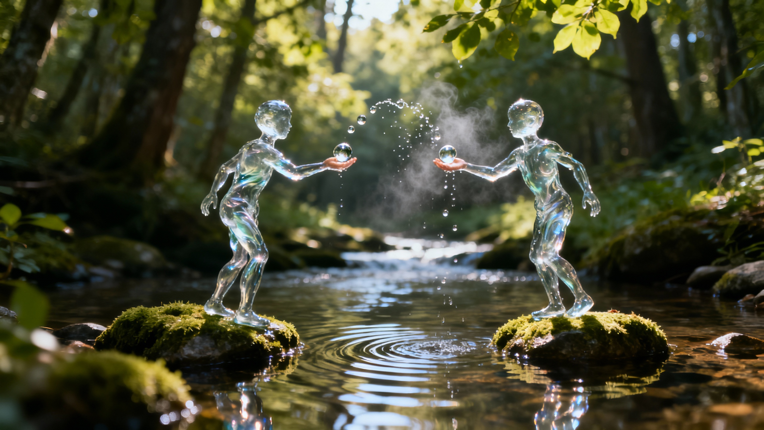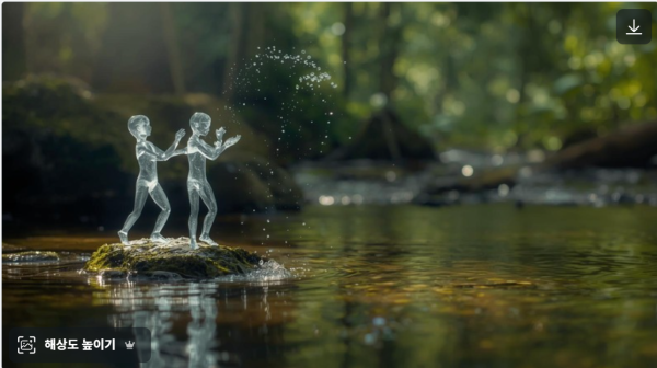 | 프롬프트 | 울창한 숲속 얕은 시냇물 위, 이끼 낀 돌 위에 두 개의 작은 인간형 존재가 서 있다. 그들은 완전히 살아있는 물로 이루어진 투명한 형체로, 몸이 끊임없이 흐르고 형태를 바꾸며 반짝인다. 두 존재는 서로에게 물방울로 만든 작은 구슬을 던지며 놀고 있고, 구슬은 공중에서 우아하게 포물선을 그리며 미세한 물방울로 흩어졌다가 다른 존재의 손 안에서 다시 하나로 합쳐진다. 주변의 시냇물에는 잔잔한 물결이 퍼지고, 나뭇잎 사이로 스며드는 햇살이 숲 안을 부드럽게 비추며 고요하고 시적인 분위기를 만든다. 얕은 피사계 심도 속에서 이 장면은 Hasselblad H6D 100mm f/2.8 렌즈로 촬영된 듯한 초현실적 디테일과 HDR 반사, 굴절 표현으로 완벽히 재현된다. 물의 인형들과 물방울은 부드럽고 유려하게 움직이며, 숲속 생명의 숨결이 느껴지는 시네마틱한 환상적 장면을 연출한다. |