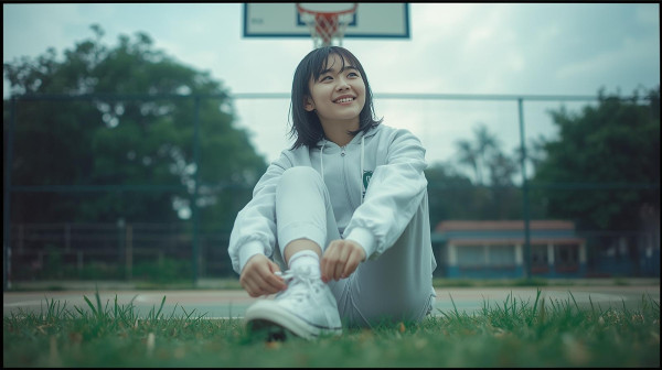| 프롬프트 | 짧은 머리의 아시아 소녀가 흰색 운동 교복을 입고, 농구대 바닥 받침에 앉아 운동화 끈을 묶고 있다. 이마 앞쪽의 잔머리는 땀에 젖어 있고, 고개를 들어 코트 밖 친구를 향해 환한 미소를 짓는다. 이미지는 고화질로 촬영되었으며, 빈티지 필름 사진 스타일을 따른다. 전경의 풀잎은 살짝 흐릿하게 표현되어 있고, 순간을 포착한 동적인 느낌이 살아 있다. 8K급 선명도, 영화 같은 조명 효과 |
