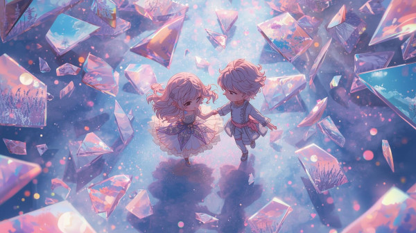 | 프롬프트 | 꿈같은 공간에서 수백 개의 빛나는 떠다니는 거울 조각들 사이로 치비 소년과 치비 소녀가 우아하게 춤추고 있다. 각 거울 조각은 서로 다른 파스텔빛의 꿈속 세계—라벤더 들판, 달빛, 이슬방울, 보랏빛 하늘—을 비춘다. 크리스털 유리 바닥은 그들의 실루엣을 은은하게 비쳐내며, 안개와 빛나는 입자들이 주변에 떠다닌다. 소녀는 파스텔 핑크와 라일락 색감의 부드러운 실타래 머리를 하고 있으며, 섬세한 금속 실과 튤 레이어로 수놓아진 핸드메이드 드레스를 입고 있다. 소년은 은색 실 자수가 들어간 정교하게 짜인 의상을 착용하고 있다. 빛나는 유리 파편들은 그들 주위를 돌며 빛줄기, 빛가루, 은은한 안개를 반사한다. 표현적인 일러스트 스타일, 초현실적이고 로맨틱한 분위기, 부드럽고 생생한 파스텔 조명, 수공예 감성의 예술적 텍스처. 그들의 움직임과 감정을 돋보이게 하는 탑다운 시네마틱 앵글로 연출됨 |