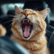 자동차를 운전하면서 하품하고 있는 고양이의 영상 장면.…