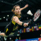 연한 붉은 배경 위에서 무중력 상태로 떠 있는 핑크색 …