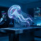 딥블루 조명이 감도는 미래형 연구실 한가운데, 랩 테이…