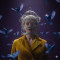 노란색 벨벳 코트를 입은 한 여성이, 은빛 철사들이 얽…