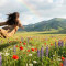 눈부신 대낮, 광활하게 펼쳐진 만개한 꽃밭 위를 한 여…