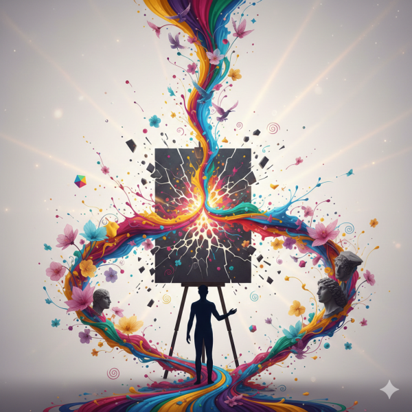 | 프롬프트 | ‘예술에는 경계가 없다’는 개념을 초현실적으로 표현한 초고화질 일러스트:한 인간의 실루엣이 캔버스 앞에 서 있고, 그 캔버스에서 색채가 프레임을 넘어서 터져 나오며 주변 공간으로 흘러간다.붓질은 빛, 꽃, 새, 추상적인 형태들, 조각의 파편 등으로 변해간다.캔버스의 경계는 부서지며, 그 조각들이 바깥으로 떠오른다.밝고 빛나는 색감, 부드러운 광선, 역동적인 움직임, 몽환적인 분위기.디테일이 매우 높고, 시네마틱한 구도. 배경은 중립적인 흰색에서 부드러운 빛으로 서서히 사라지며 마무리. 8K 고해상도.“ |