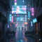 비 오는 사이버펑크 도시의 뒷골목, 네온사인 간판, 홀…