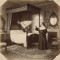 오래된 사진 속, 한 어린 소녀가 침대 위에서 공중에 …