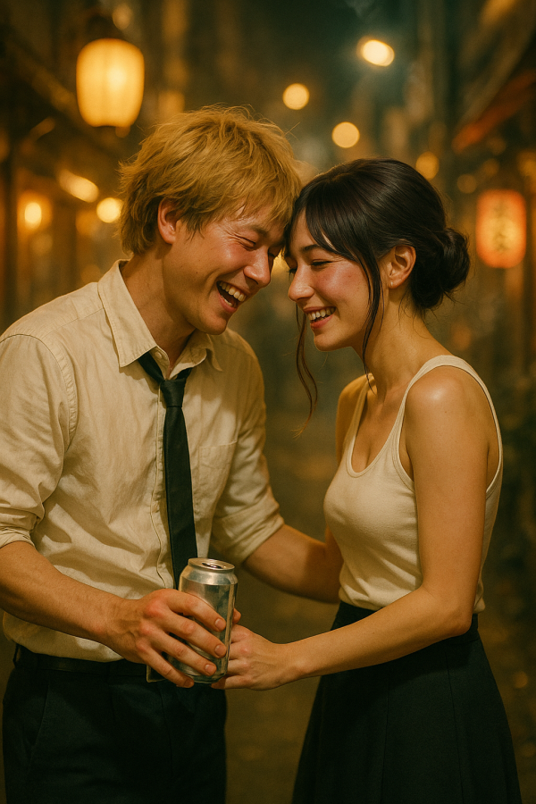 일본 젊은 남녀 두 사람이 1990년대 도쿄의 따뜻한 밤거리 골목에서 서로 가까이 마주 서 있음. 둘 다 술에 취해 행복해 보이며, 얼굴에 홍조가 돌고 기분 좋게 웃고 있음.