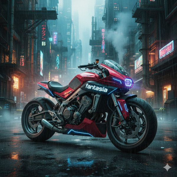 | 프롬프트 | \"사이드에 'fantasia' 로고가 있는 빨간색과 검정색 오토바이, 산업 지대에 주차되어 있음, 사이버펑크 스타일, 고해상도, 고디테일, 시네마틱 조명 효과, 전문가 수준의 사진, 고품질. --ar 51:91 --bs 1 --motion high --raw |