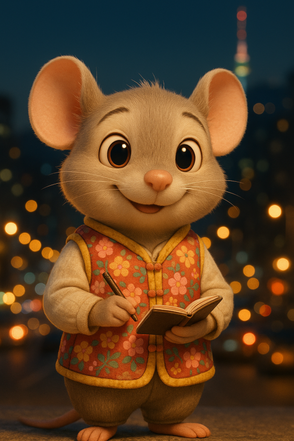 | 프롬프트 | 귀엽고 친근한 만화 스타일의 생쥐 캐릭터가 두 발로 서 있음. 크고 표현력 있는 눈, 부드러운 털 질감, 따뜻하고 호감 가는 미소를 지님. 한국 전통 시골 무늬가 있는 꽃무늬 솜조끼를 입고 있으며, 작은 노트북이나 펜을 들고 있음. 서울의 도시 야경을 배경으로 흐릿한 조명이 번짐. 따뜻한 색감의 팔레트, 픽사 수준의 고퀄리티 렌더링, 매우 디테일하고 매력적인 마스코트 스타일 디자인, 텍스트 없음. |