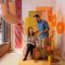 이 배경에 한 여자가 소파에 앉아있고 한 남자는 옆에 …