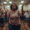 여성이 손뼉을 치고 발을 구르며 찬양 춤을 추는 장면,…