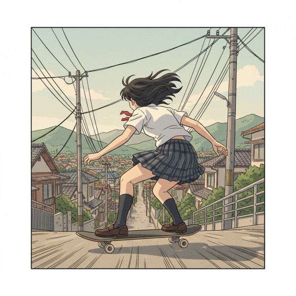 | 프롬프트 | 애니메이션 스타일만, 리얼리즘 금지, 포토리얼 요소 없음. 손으로 그린 2D 애니메이션 느낌. 고등학생 소녀가 스케이트보드를 타고 높은 속도로 내리막을 내려가는 순간을 뒤쪽에서 포착한 장면. 카메라가 매우 가까운 낮은 후방 추적 각도에 위치해 있어, 소녀가 프레임에서 크고 강하게 강조된다. 스케이트보드는 내리막 경사와 자연스럽게 일직선 방향으로 정렬되어 있으며, 발의 위치도 정확하다. 바람을 가르며 달려 머리카락과 교복(셔츠와 치마)이 강하게 휘날린다. 배경에는 쇼와 시대 일본의 기와지붕 가옥, 반복되는 전봇대와 두꺼운 전선, 그리고 부드러운 산이 있는 향수 어린 일본 마을 풍경이 펼쳐져 있으며, 반복(loop) 영상에 적합하도록 시각적으로 일관성 있게 구성된다. 전면 뷰는 금지, 리얼리즘 금지, 실사 질감 금지. 루프 영상 생성에 적합한 역동적인 중간 액션 순간. |