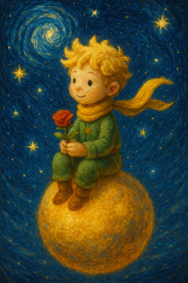 | 프롬프트 | 반 고흐풍의 소용돌이치는 은하수 하늘 아래, 빛나는 작은 행성 위에 앉아 있는 양모 펠트 어린 왕자 인형. 황금빛 목도리가 바람에 부드럽게 흩날리고, 손에는 장미를 들고 있다. 주위를 감싸는 빛나는 별들과 은빛-푸른 우주의 광채, 수공예 펠트 텍스처, 몽환적인 인상주의 조명, 고요하고 시적인 분위기. |