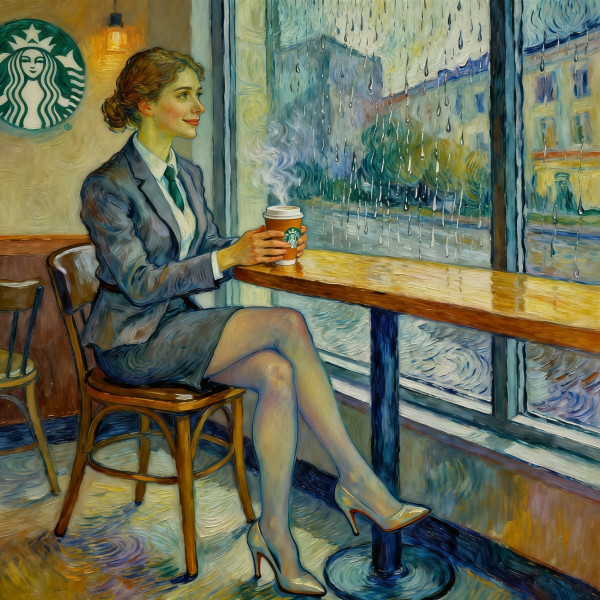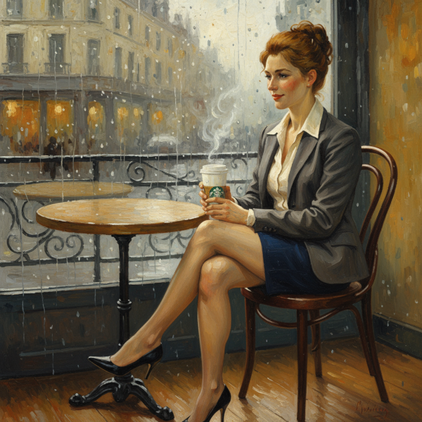 프롬프트 | A Van Gogh style painting of a young French office worker in her twenties, seated gracefully on a Starbucks cafe chair at a wooden table by the window on a rainy day. She\\\\\\\\\\\\\\\\\\\\\\\\\\\\\\'s dressed in a neat office outfit with a short skirt, |