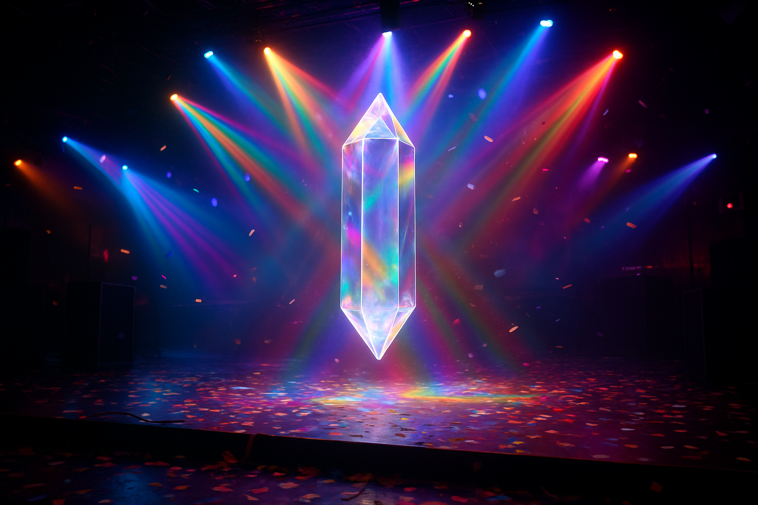 | 프롬프트 | 클럽 무대 중앙에 투명한 크리스털 기둥이 공중부양하고 있다. 현란한 천장 사이키 조명이 빛나고, 그 빛이 크리스털에 무지개 빛 몽롱한 효과를 낸다. 파티가 열린 듯 폭죽 색종이가 여기 저기 흩어져 있는데 사람들은 아무도 없다. 그림을 그려보자. |