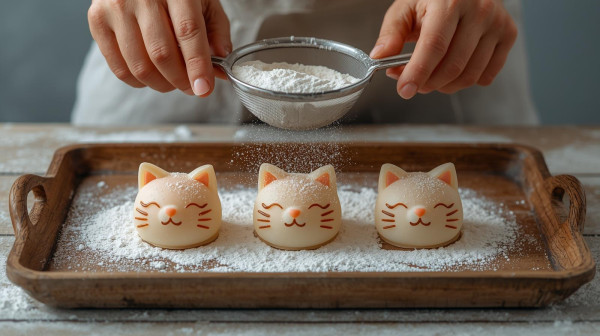 화면 안으로 한 쌍의 손이 들어오더니, 세 마리 고양이 모양 만두 위에 하얀 밀가루를 톡톡 뿌린다.곧이어 손은 밀대를 꺼내어 고양이 만두를 꾹 눌러 으깨기 시작한다.그 과정에서도 고양이들은 놀라거나 소리를 내지 않고 조용히, 가끔씩 눈만 깜빡이며 반응할 뿐이다.