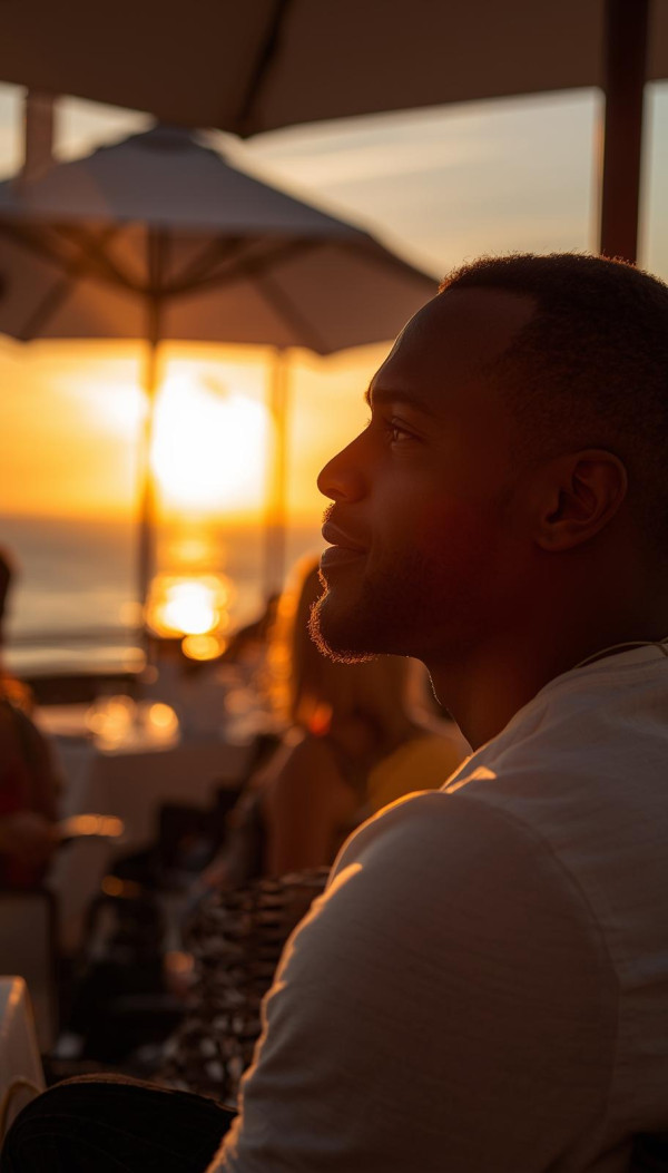 프롬프트 황금빛 노을이 내려앉은 해변가 레스토랑 테라스. 30대 중반의 잘생긴 흑인 남성이 테라스 자리에 앉아 있는 장면으로, 미디엄 클로즈업 샷으로 시작합니다. 따뜻한 석양빛이 그의 얼굴을 부드럽게 비추고, 그는 테라스 맞은편에 있는 여성을 바라봅니다. 고개를 자연스럽게 살짝 움직이고, 현실적인 호흡이 표현됩니다. 잠시 후, 그는 부드럽고 매력적인 윙크를 보내며 잔잔한 미소를 지은 채 다시 석양을 바라봅니다. 배경에는 약간 흐릿하게 보이는 파라솔, 식사 중인 사람들, 잔잔한 바다 반사광이 함께 어우러집니다.