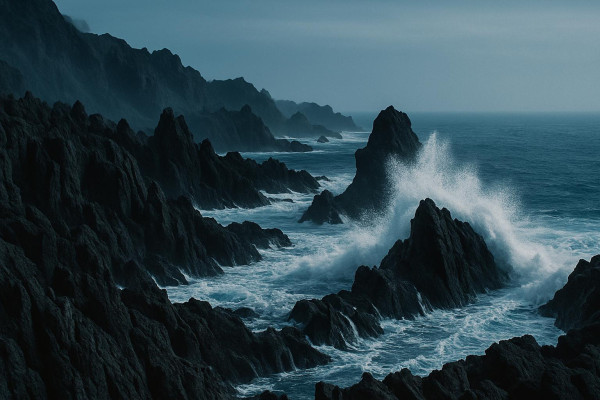 | 프롬프트 | “검은 화산 해안선을 담은 와이드 시네마틱 샷, 톱니처럼 날카로운 바위들, 어두운 돌에 부딪히며 거세게 부서지는 하얀 포말의 파도, 은은한 안개가 깔린 차가운 푸른 하늘, 강한 대비의 조명, 극도로 사실적인 텍스처, 분위기 있는 무드, 에디토리얼 패션 배경 |