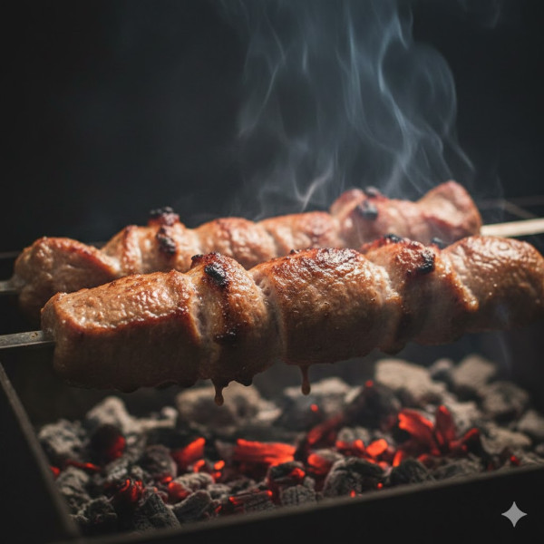 프롬프트 이전 장면의 연속 컷:붉게 달아오른 숯불 위에서 천천히 구워지고 있는 고기 꼬치(샤슬릭).육즙이 가득한 고기 표면에는 풍부한 질감이 살아 있으며, 은은한 갈변과 캐러멜라이징이 뚜렷하게 보임.지방이 숯불 위로 떨어지면서 부드러운 연기가 은근히 피어오름.