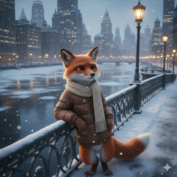 | 프롬프트 | 천천히 팬 아웃되며 항공 샷으로 전환된다. 겨울 도시의 눈 덮인 다리 난간에 기대 서 있는 의인화된 여우가 보인다. 여우는 갈색 패딩 다운 재킷과 두꺼운 니트 목도리, 장갑을 착용하고 있다. 눈송이가 내리고, 털과 옷 위에는 눈이 소복이 쌓여 있다. 배경에는 얼어붙은 강 수면과 눈으로 덮인 도심의 고층 빌딩들, 따뜻하게 빛나는 가로등이 보인다. 차가운 색조의 부드러운 조명이 강조된 쿨한 겨울 분위기. 디즈니 애니메이션 영화 스타일, 매우 디테일한 털 질감, 시네마틱한 구도, 8K, 사실적인 렌더링. |