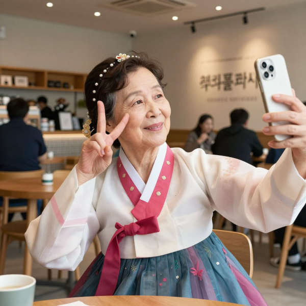 요즘 SNS에서 핫한 시니어 인플루언서 컨셉으로 이미지를 생성해봤습니다. 한복 퓨전 패션에 셀카 포즈까지, 손주보다 더 트렌디한 할머니의 모습이에요!