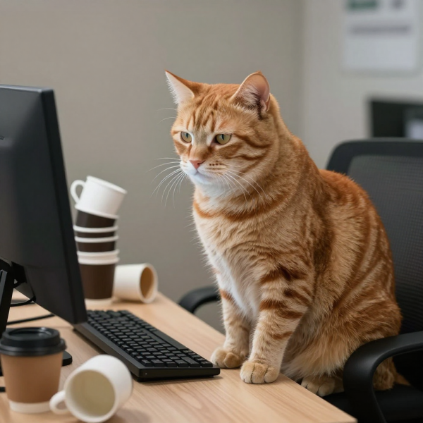 프롬프트 Orange tabby cat sitting at computer desk looking exhausted, pile of coffee cups, Monday morning mood, office worker vibes, dramatic lighting, meme style photography