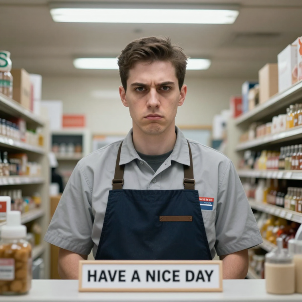프롬프트 A retail worker in uniform with an extremely deadpan blank stare directly at the camera, completely unimpressed expression, standing behind a counter with 'HAVE A NICE DAY' sign, fluorescent lighting, the most uninterested face possible, meme energy, photorealistic portrait, viral TikTok aesthetic