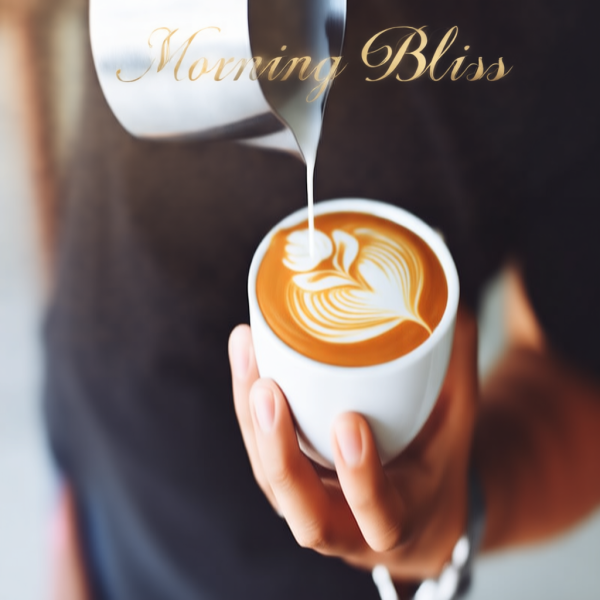 프롬프트 Add stylish text 'Morning Bliss' in elegant gold script at the top, with soft lens flare and warm morning sunlight atmosphere