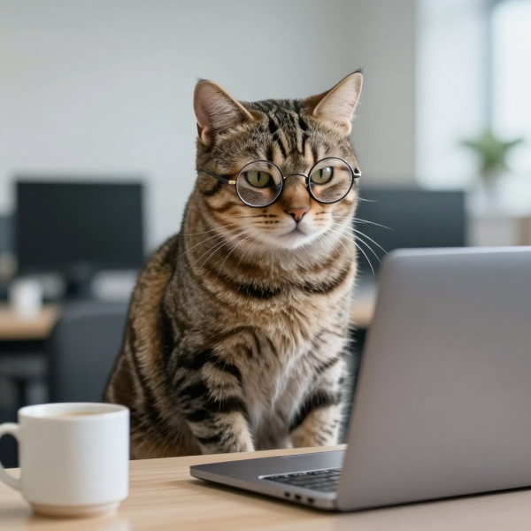 프롬프트 A tabby cat sitting at a desk with tiny round glasses, looking at a laptop with a judgmental blank stare, office environment, coffee mug nearby, meme energy, soft natural lighting, documentary style photography