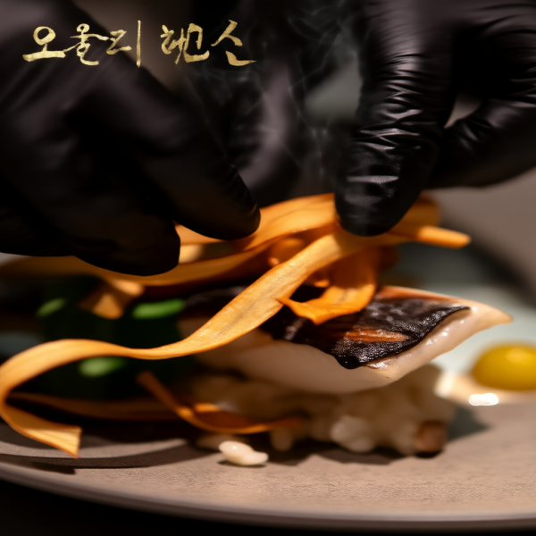 프롬프트 Add elegant Korean calligraphy text overlay saying '오늘의 특선' (Today's Special) in the top left corner with gold foil effect. Add subtle steam rising from the food and enhance the plating presentation with professional food photography lighting.