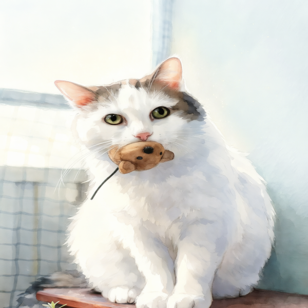 장난감 쥐를 물고 있는 귀여운 고양이 사진을 스튜디오 지브리 스타일로 변환해봤어요.