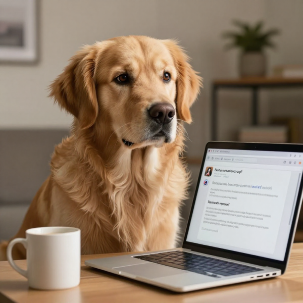 | 프롬프트 | A golden retriever with a shocked Gen Z expression staring blankly at a laptop screen showing error messages, home office setup with coffee mug, dramatic lighting, meme energy, viral TikTok style, photorealistic |