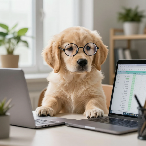 | 프롬프트 | Portrait of a golden retriever puppy wearing tiny round reading glasses, sitting at a desk with a laptop computer, looking confused at spreadsheets on screen, home office setup with houseplants, soft window lighting, adorable expression, viral pet photo style, documentary photography |