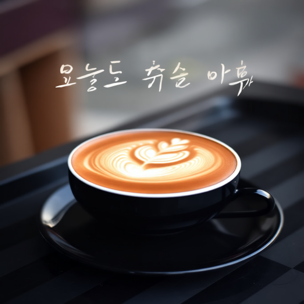 | 프롬프트 | Add elegant Korean calligraphy text '오늘도 좋은 하루' (Have a good day) in white stylish font floating above the latte art with soft glow effect, like a cozy cafe menu board design |