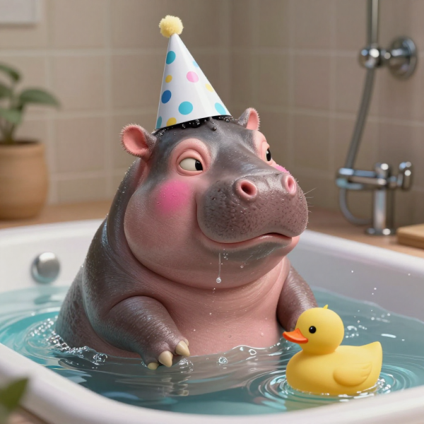 | 프롬프트 | A chubby pygmy hippo wearing a tiny party hat sitting in a hot tub looking confused at a floating rubber duck, viral Moo Deng inspired meme style, pink cheeks, sassy expression, water splashing, absurd humor, photorealistic, trending social media aesthetic, dramatic bath lighting |