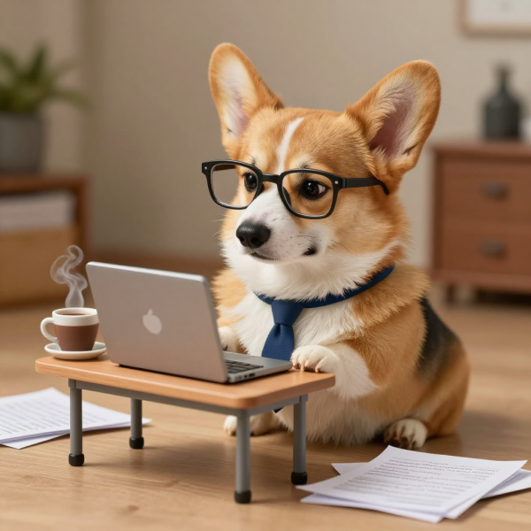 | 프롬프트 | A corgi dog sitting at a tiny office desk wearing reading glasses and a tiny necktie, looking exhausted while staring at a miniature laptop screen, messy papers scattered around, coffee cup with steam, frustrated expression, meme style, warm indoor lighting, photorealistic, humorous corporate burnout theme |