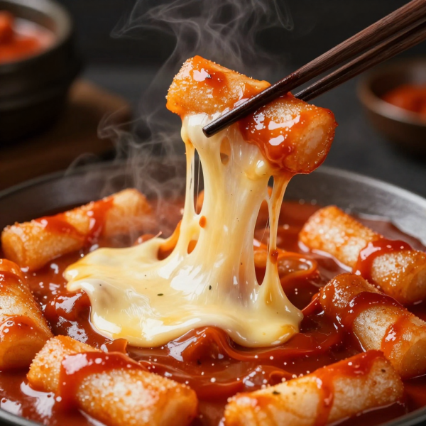 프롬프트 Extreme close-up of Korean tteokbokki street food, steaming hot rice cakes in rich red gochujang sauce, melted cheese pull moment, dramatic dark moody lighting, shallow depth of field, food photography, glossy sauce texture, chopsticks lifting one piece, professional commercial food shot