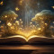 나무 테이블 위에 한 권의 열린 책이 놓여 있고, 그…