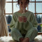표정이 풍부하고 눈을 감은 채 부드럽게 미소 짓는 밝은…