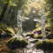 울창한 숲속 얕은 시냇물 위, 이끼 낀 돌 위에 두 개…
