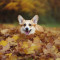 가을 낙엽 더미 속에서 점프하며 뛰어나오는 코기가 익살…